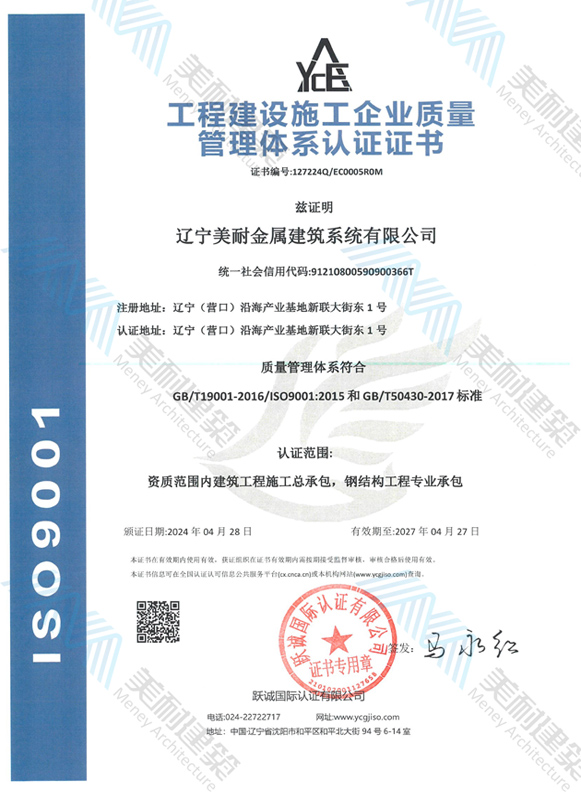 遼寧美耐金屬建筑系統(tǒng)有限公司位于遼寧(營口)沿海產(chǎn)業(yè)基地,專注于預制金屬建筑系統(tǒng)領(lǐng)域,是一家集工業(yè)建筑設計、制作、施工及相關(guān)的技術(shù)咨詢與服務為一體的綜合性服務企業(yè)。作為國家鋼結(jié)構(gòu)協(xié)會會員、中國建筑金屬結(jié)構(gòu)協(xié)會會員單位與國家高新技術(shù)企業(yè),美耐建筑集建筑工程施工總承包、鋼結(jié)構(gòu)工程專業(yè)承包等多種資質(zhì)于一身,并擁有22項鋼結(jié)構(gòu)建筑領(lǐng)域?qū)@?項軟件著作權(quán)。